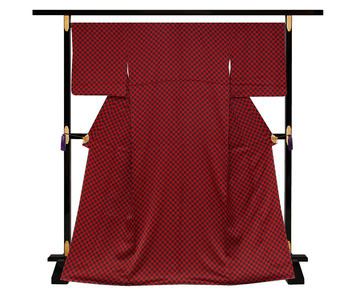 市松模様 小紋 着物 きもの 赤 赤地 赤黒 個性柄 綸子 りんず